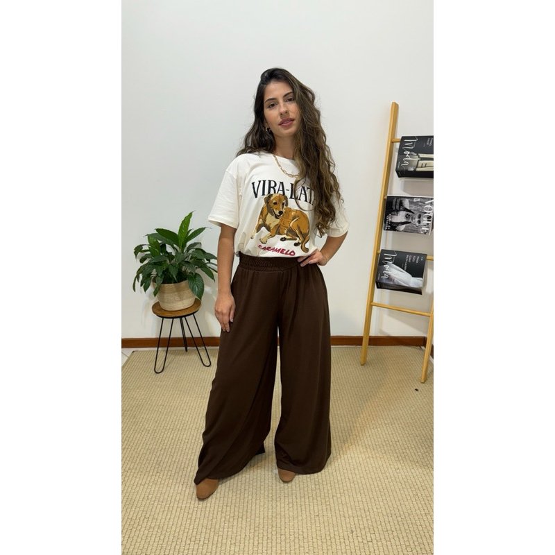 Calça F. Canelada Marrom, possui elástico na cintura, tecido canelado, modelagem reta e solta, estilo pantalona, comprimento longo, sem bolsos, com tag