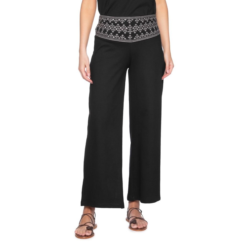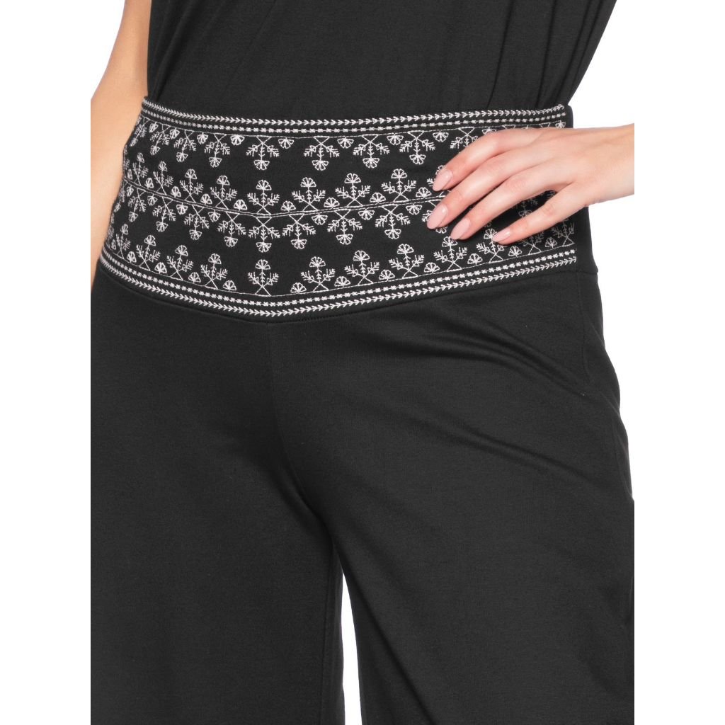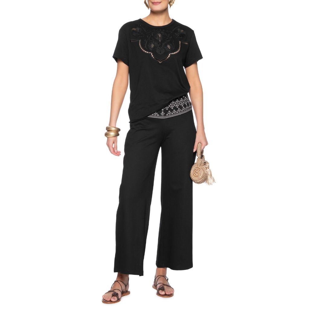 Calça M.F. Pala Bordado, possui tecido leve sem elasticidade, modelagem solta ao corpo, cintura média, cós largo com bordados, recorte posterior com elástico embutido e comprimento longo, com tag