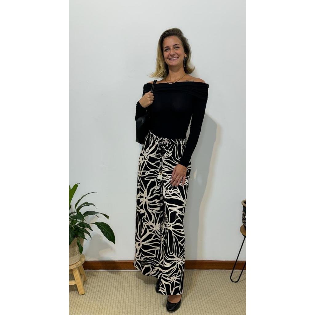 Calça MF. Pantalona Flores, possui tecido leve e fluido, elástico na cintura, modelagem ampla e detalhe nas pontas do cordão, bolsos nas laterais com tag.