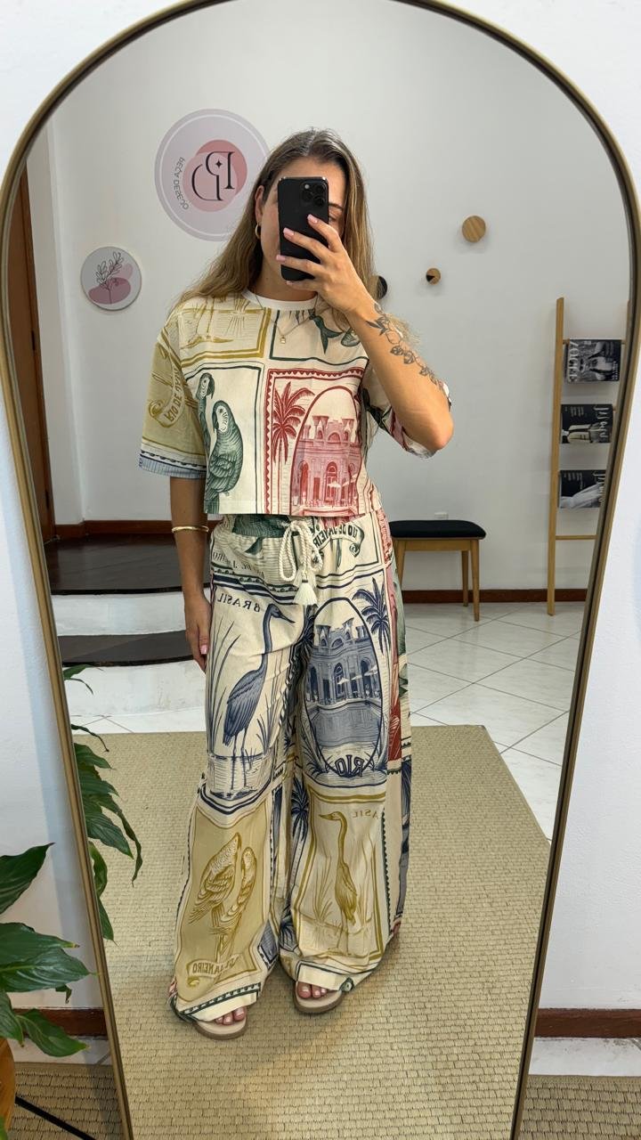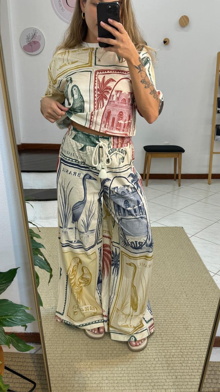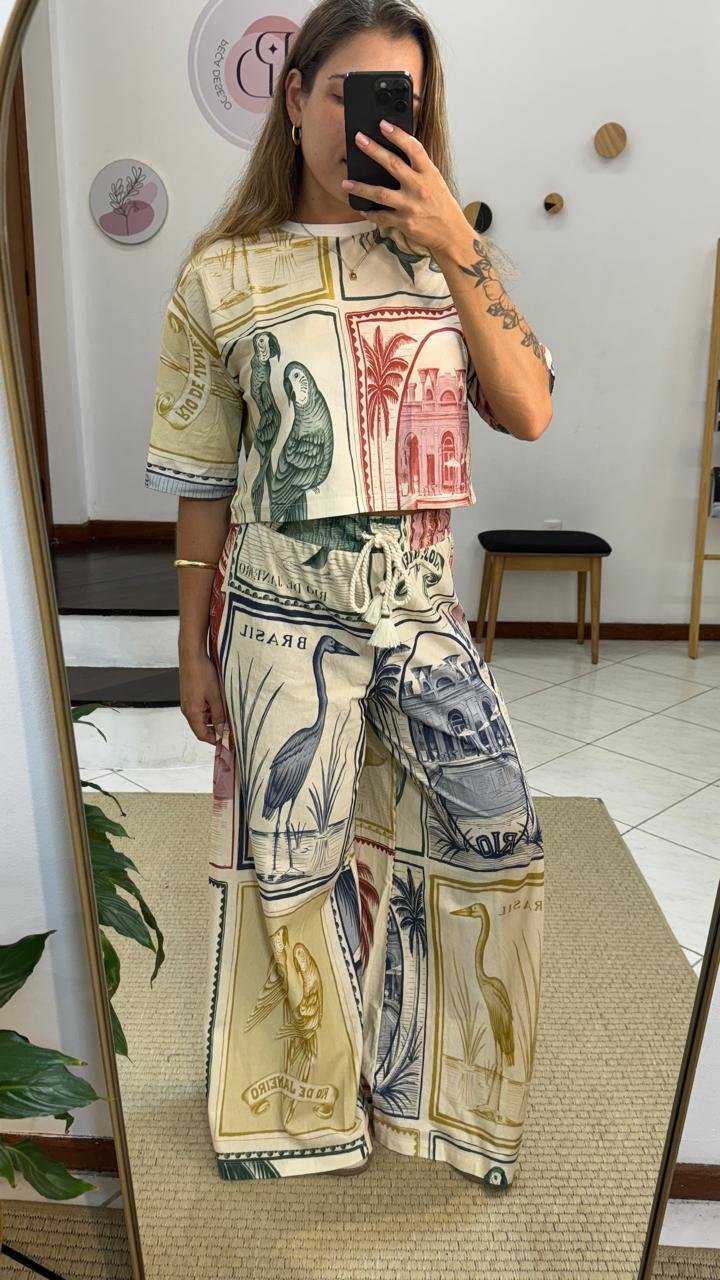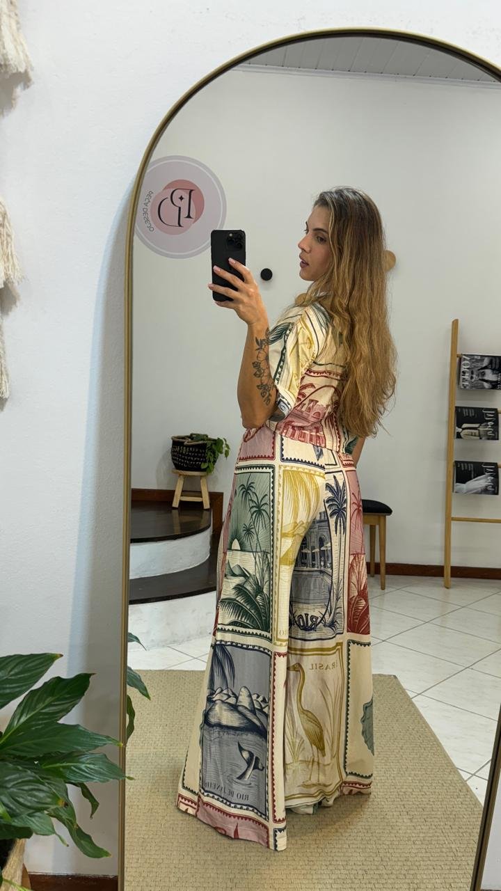 Calça Pantalona F. Brasil Vintage, possui elástico no cós, tecido leve e fluido, modelagem larga nas pernas, estilo pantalona, tecido estampado, cordão com ponteira diferenciada, sem bolsos, com tag