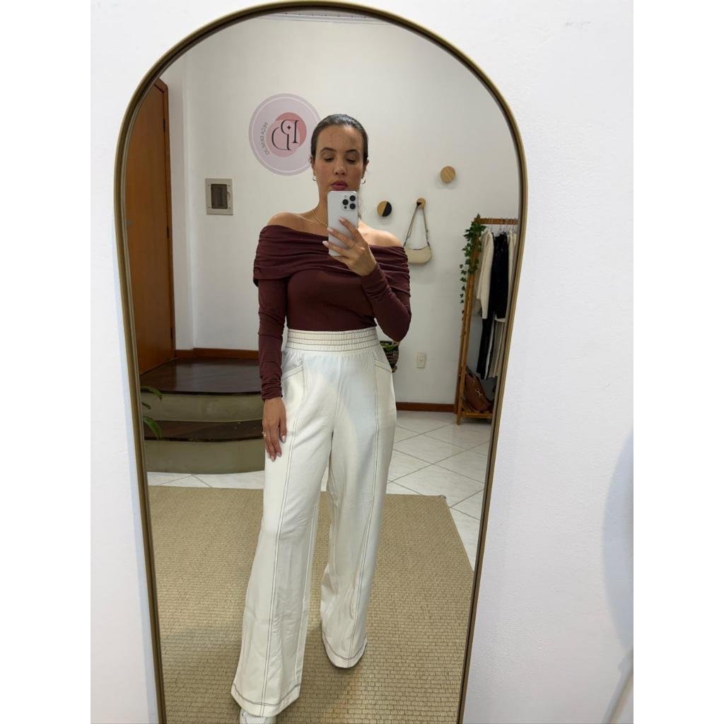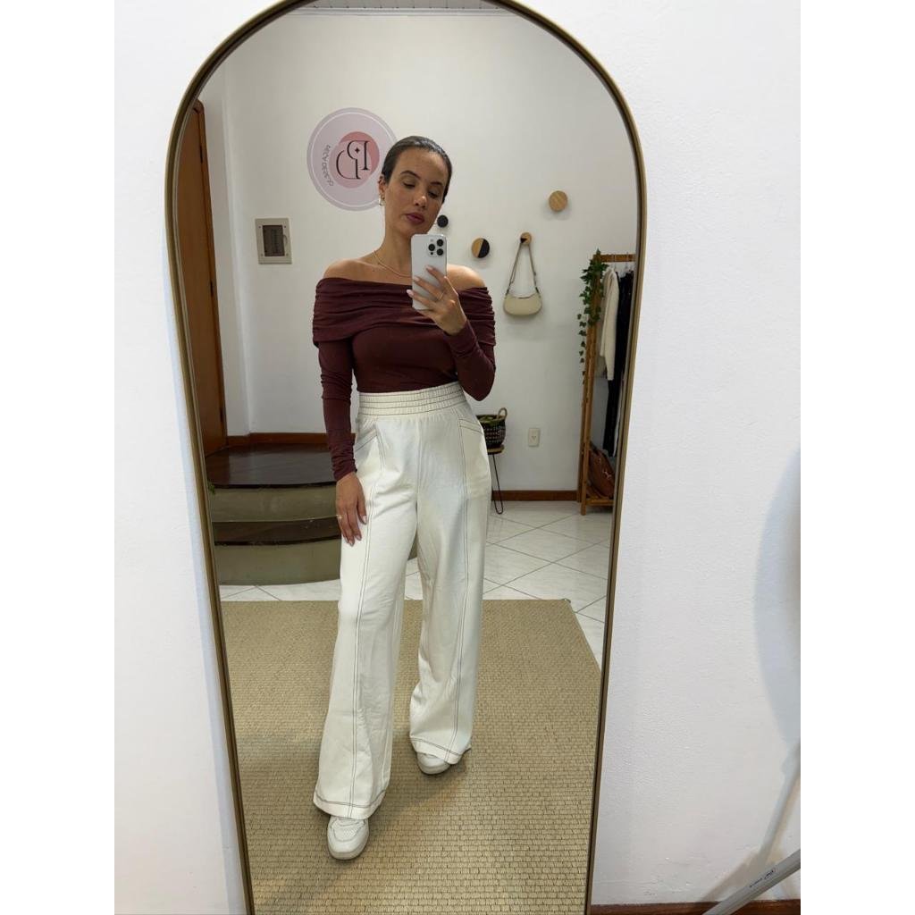 Calça Shoulder Off Moletinho, modelagem pantalona levemente flare, elastico na cintura, bolsos laterais, com detalhes de pesponto marrom em contraste, com tag