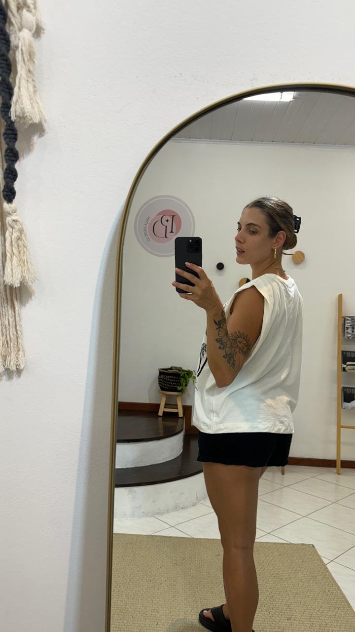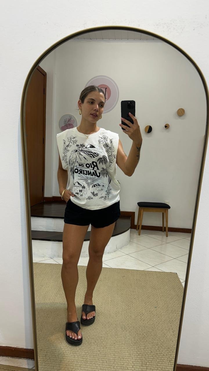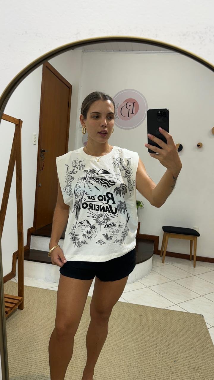 Regata Quadrada Rio De Janeiro, possui gola redonda de ribana, sem mangas e com pregas abertas no alto dos ombros, modelo de malha e modelagem reta, com tag