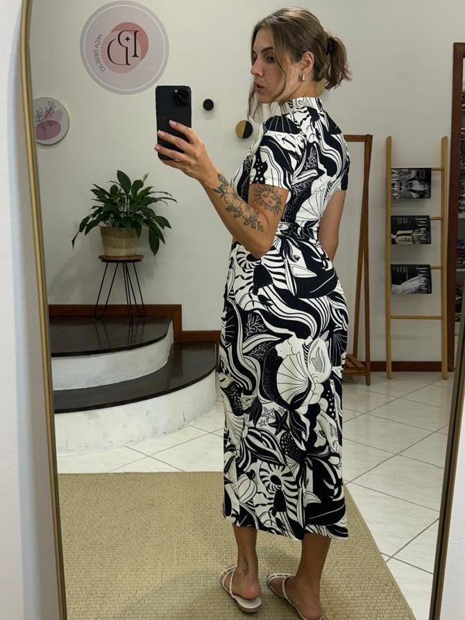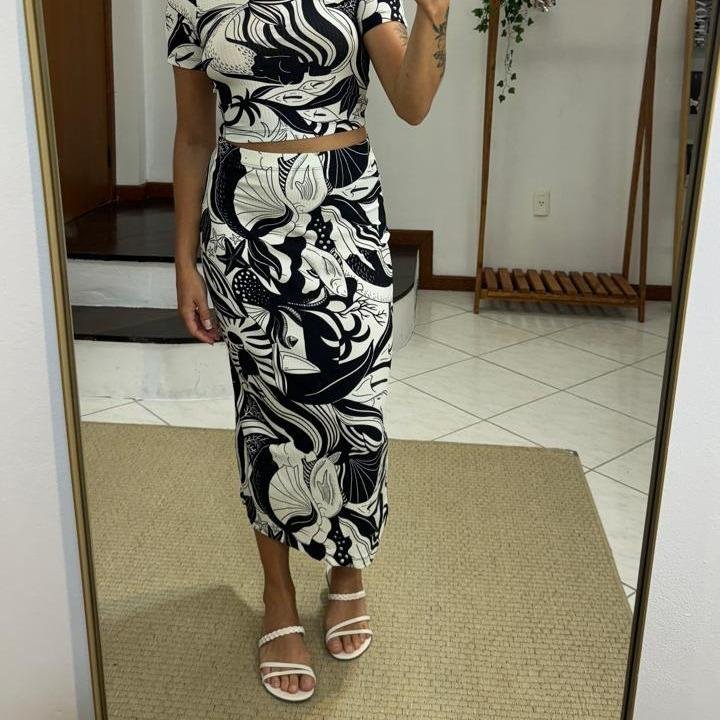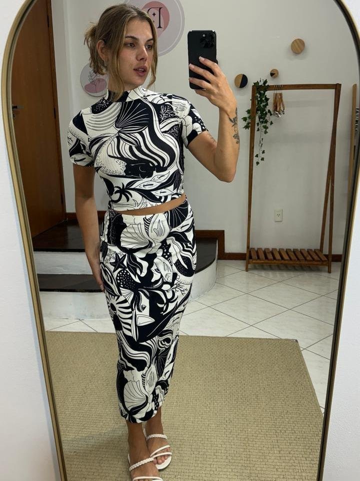 Saia Canelada Estampada Festa de Mar, possui malha leve com alta elasticidade canelada, cintura alta, cós com elástico embutido, estampa em cor contrastante e comprimento midi, original com tag.