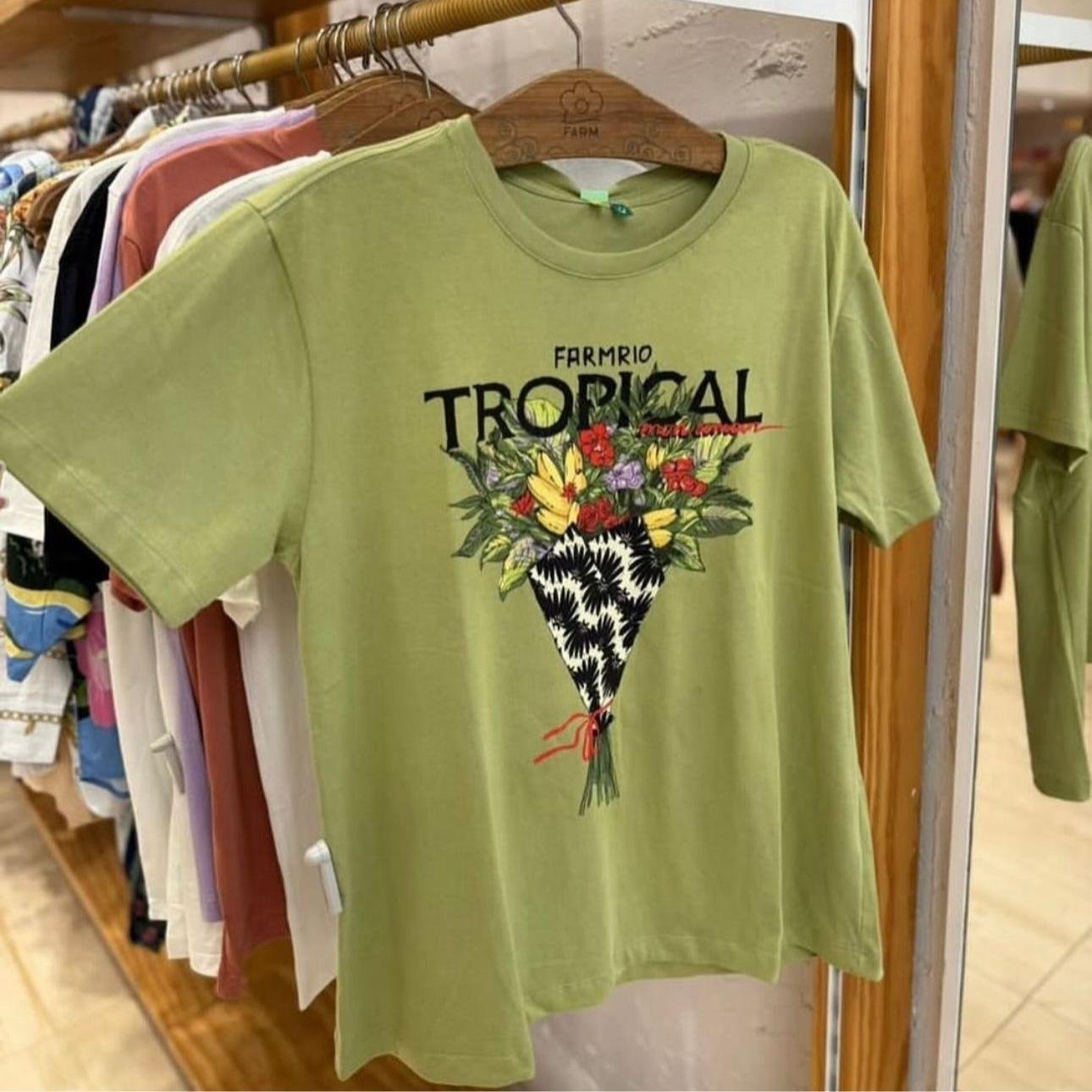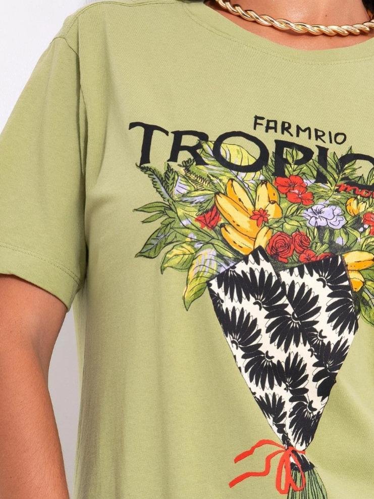T-shirt Bouquet Tropical Verde, possui modelagem solta e mangas curtas, decote redondo com acabamento canelado, estampa frontal de escrita e figurativa em cores contrastantes e acabamento pespontado, com tag.