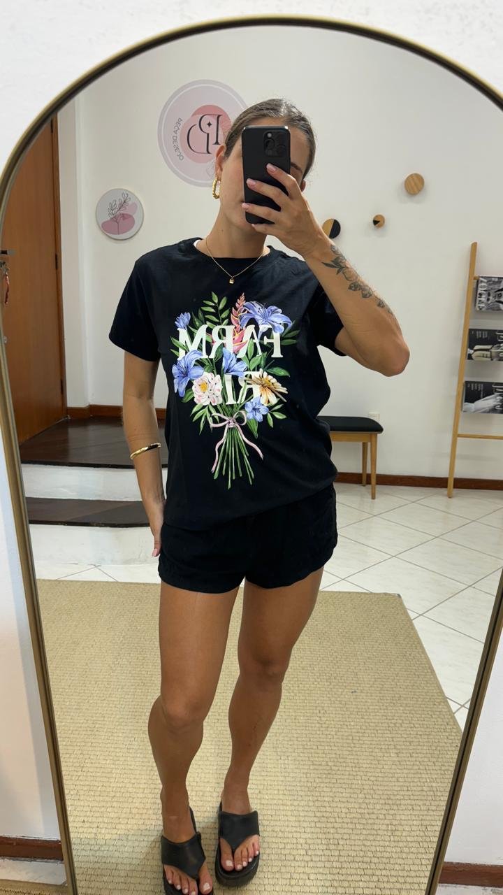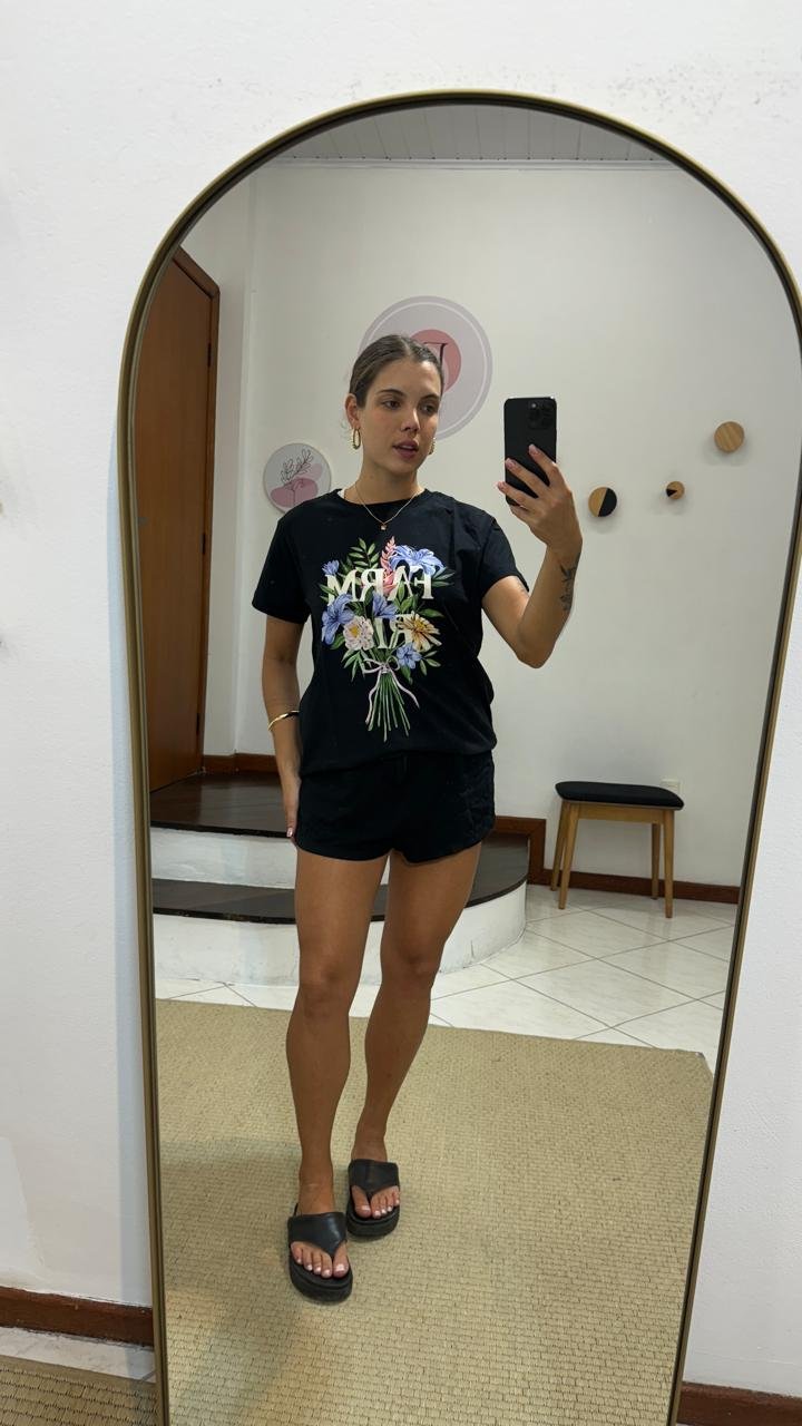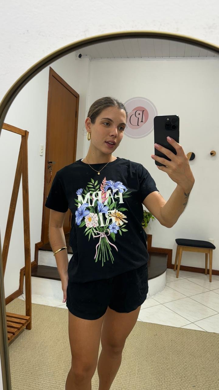T-shirt F. Fit Buquê Preta, com modelagem solta e mangas curtas, possui decote redondo com acabamento canelado, estampa frontal de escrita e figurativa em cores contrastantes e acabamento pespontado.