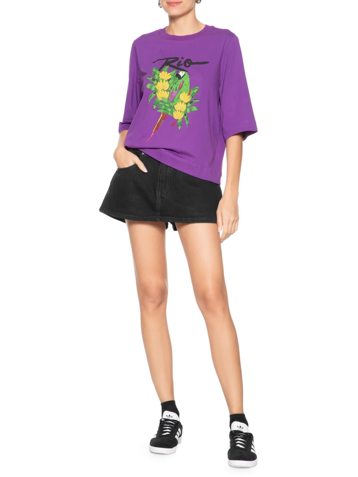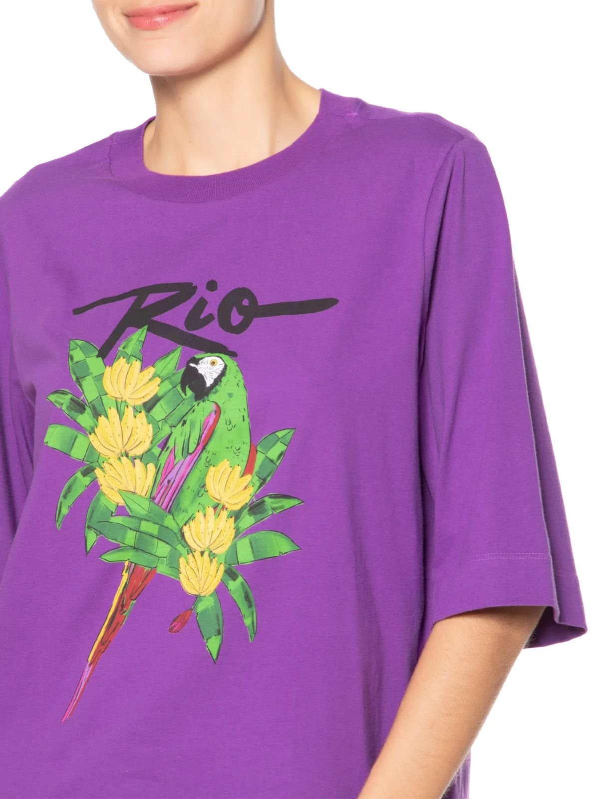 T-shirt Feminina Mangão Rio: é confeccionada em malha de algodão com alta elasticidade. A peça solta ao corpo possui decote redondo com acabamento canelado, mangas curtas e estampa frontal em silk com cores contrastantes.