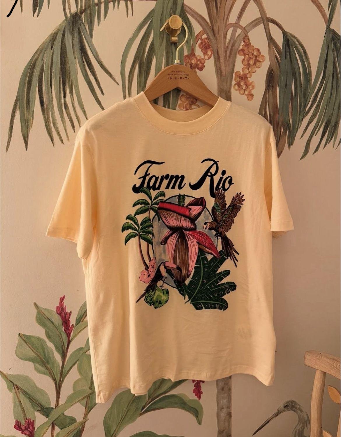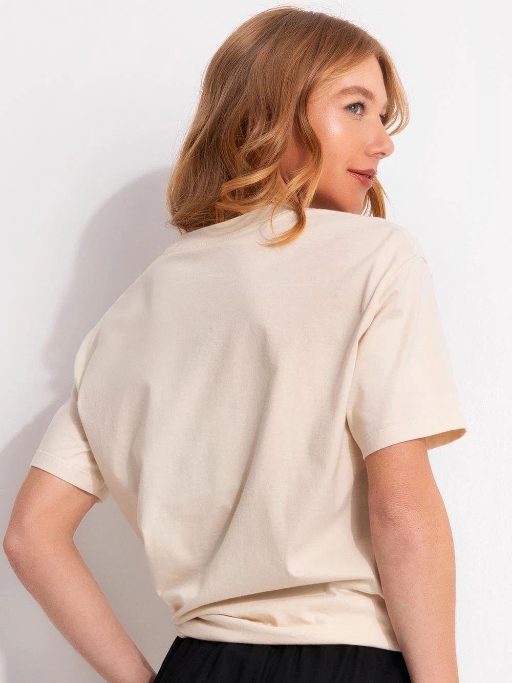 T-shirt Média Mangara Bege, com modelagem solta e mangas curtas, possui decote redondo com acabamento canelado, estampa frontal de escrita e figurativa em cores contrastantes e acabamento pespontado.