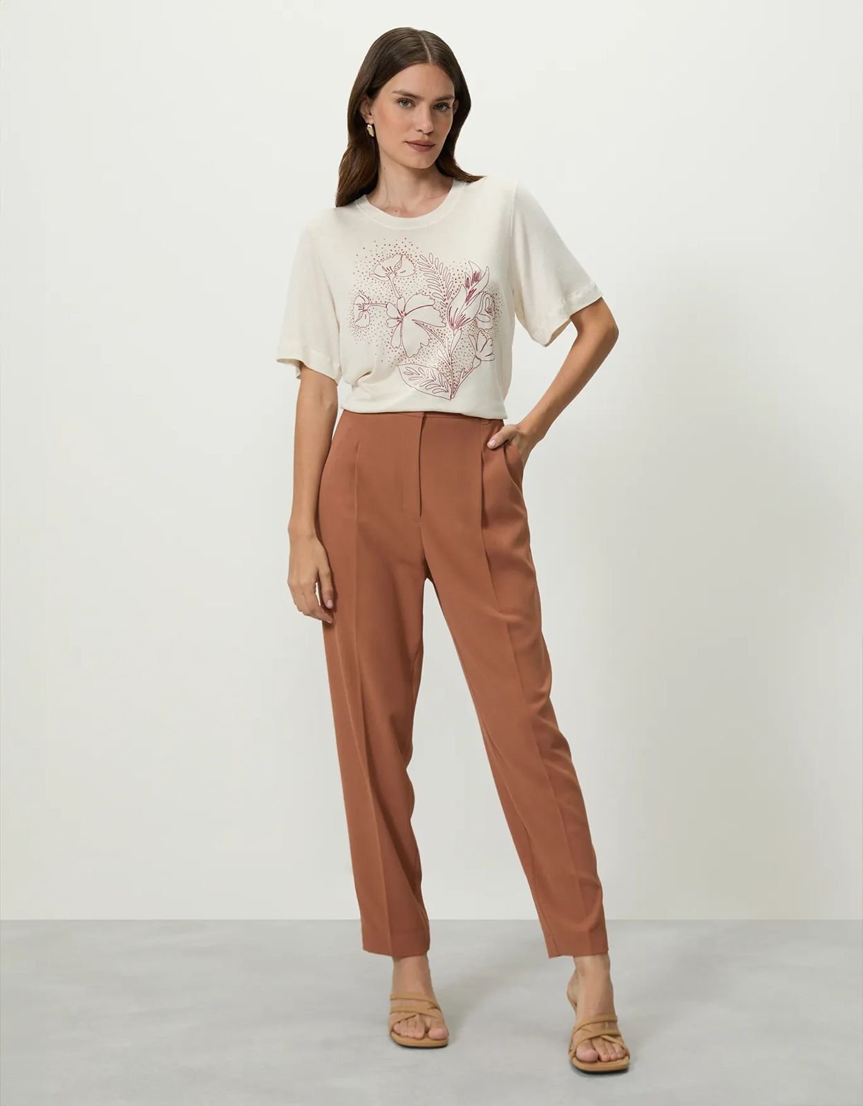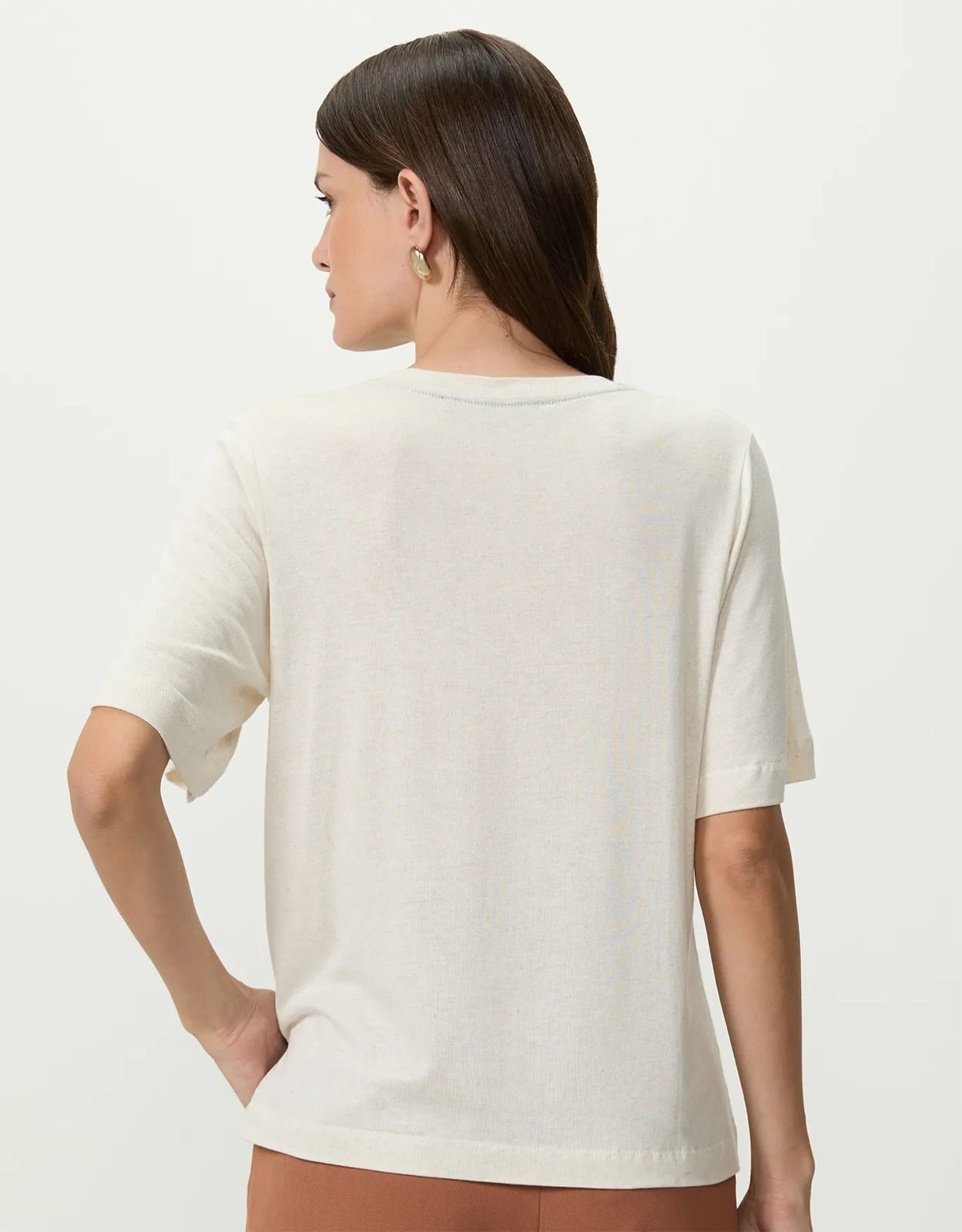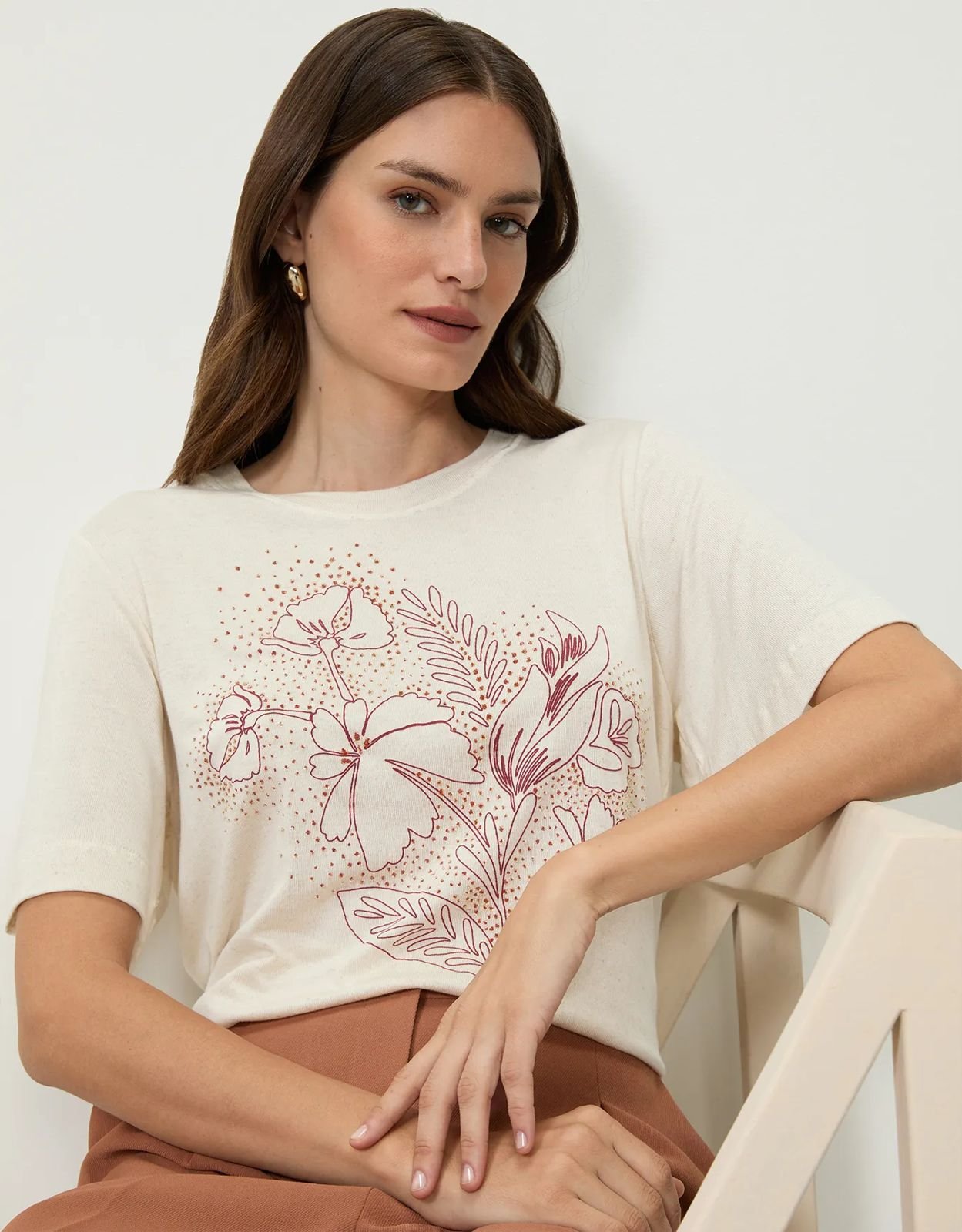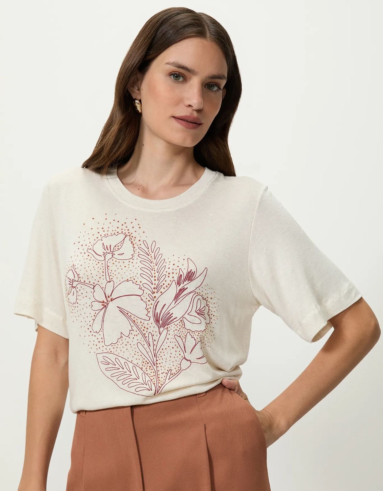 T-shirt shoulder floral hibisco outline, possui gola redonda, estampa frontal com alguns termocolantes brilhosos, tecido leve e confortável, mangas curtas, shape solto, acabamento pespontado.