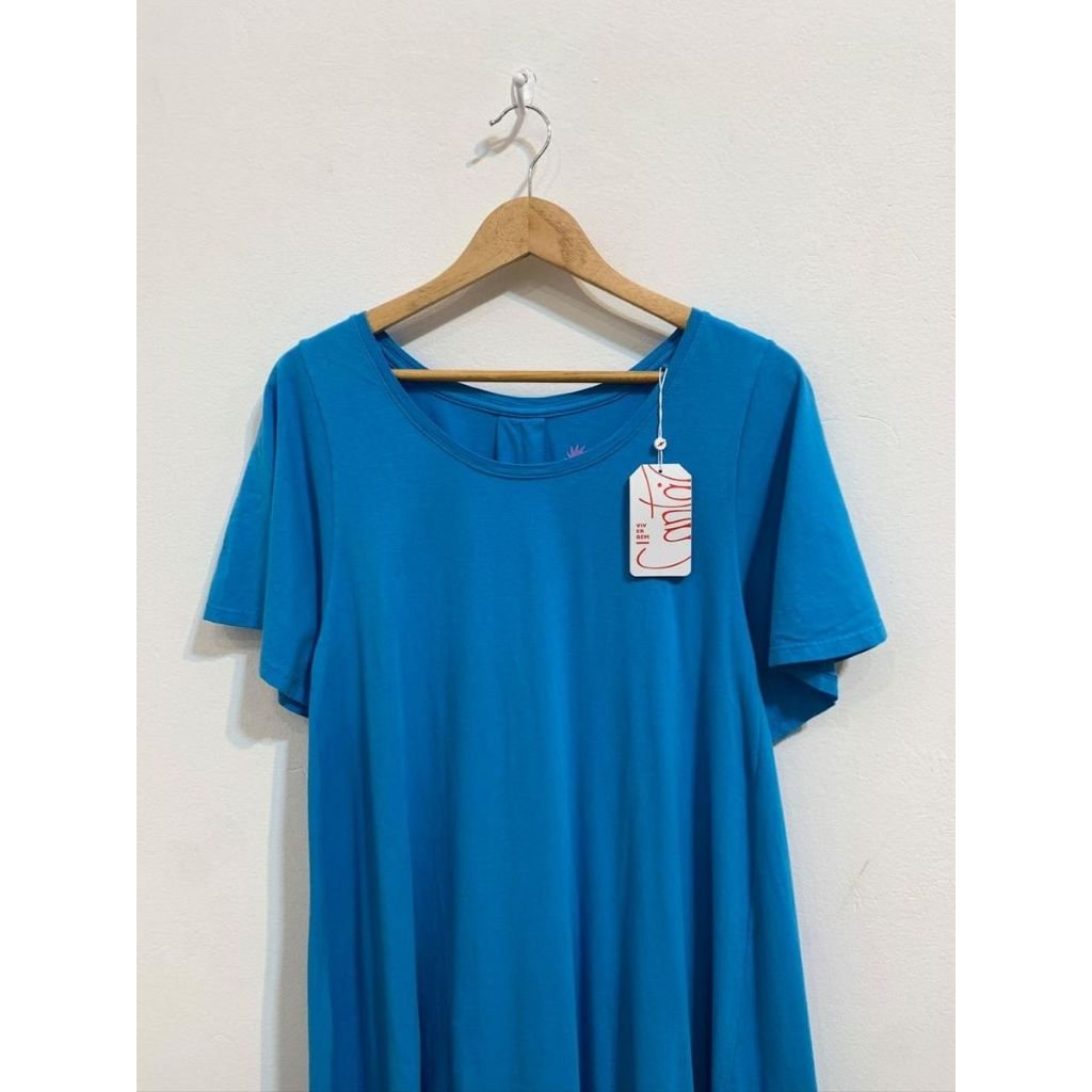 Vestido cantão curto amplo azul, possui mangas curtas, gola canoa, detalhe franzido nas costas, comprimento curto, tecido leve e confortável, com tag