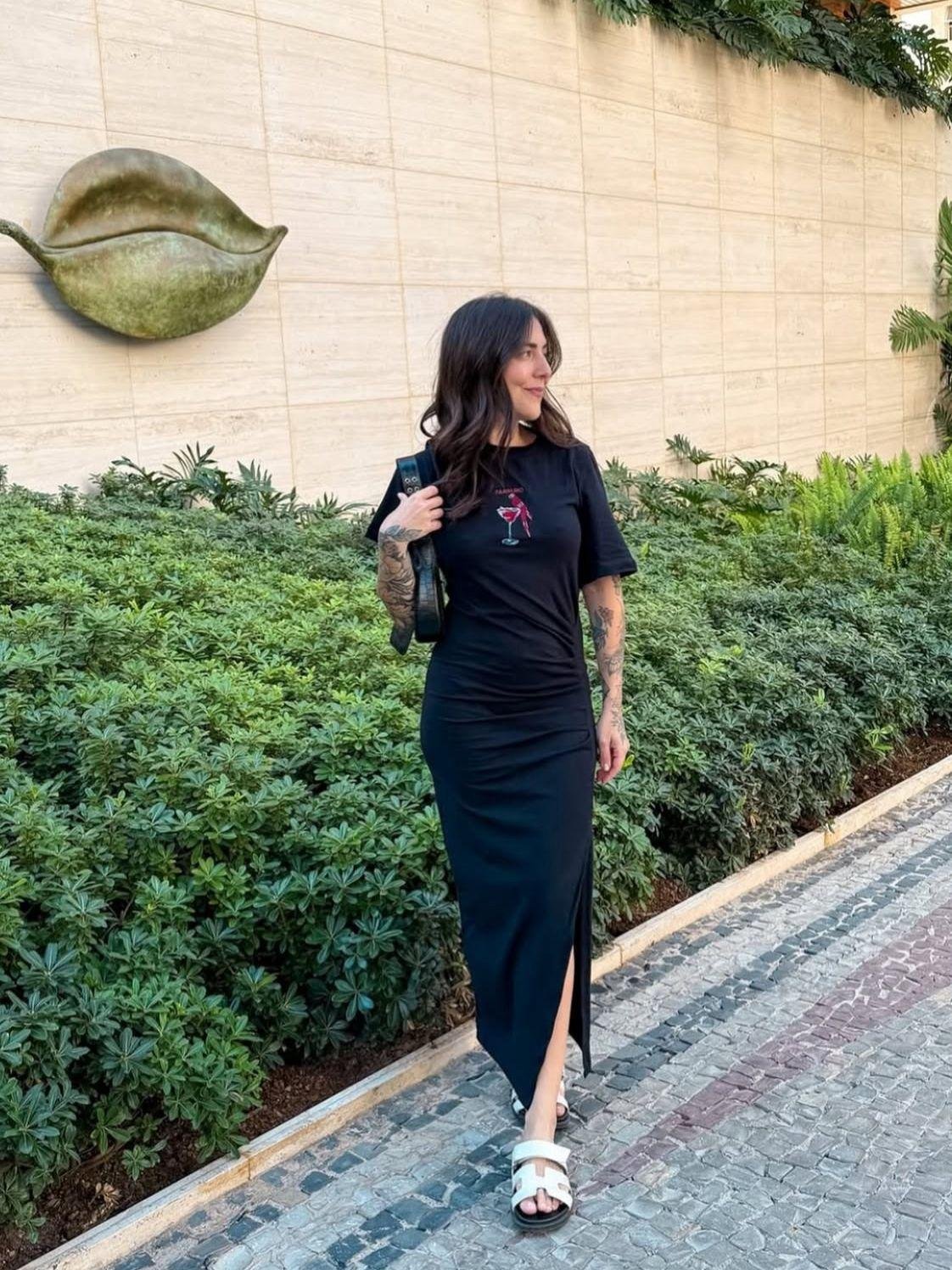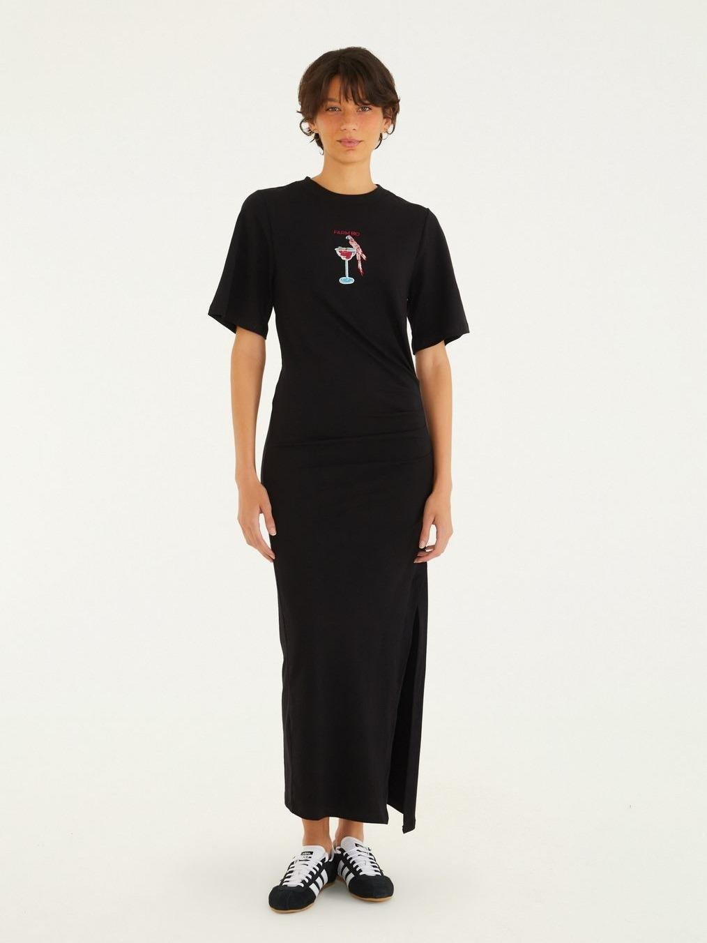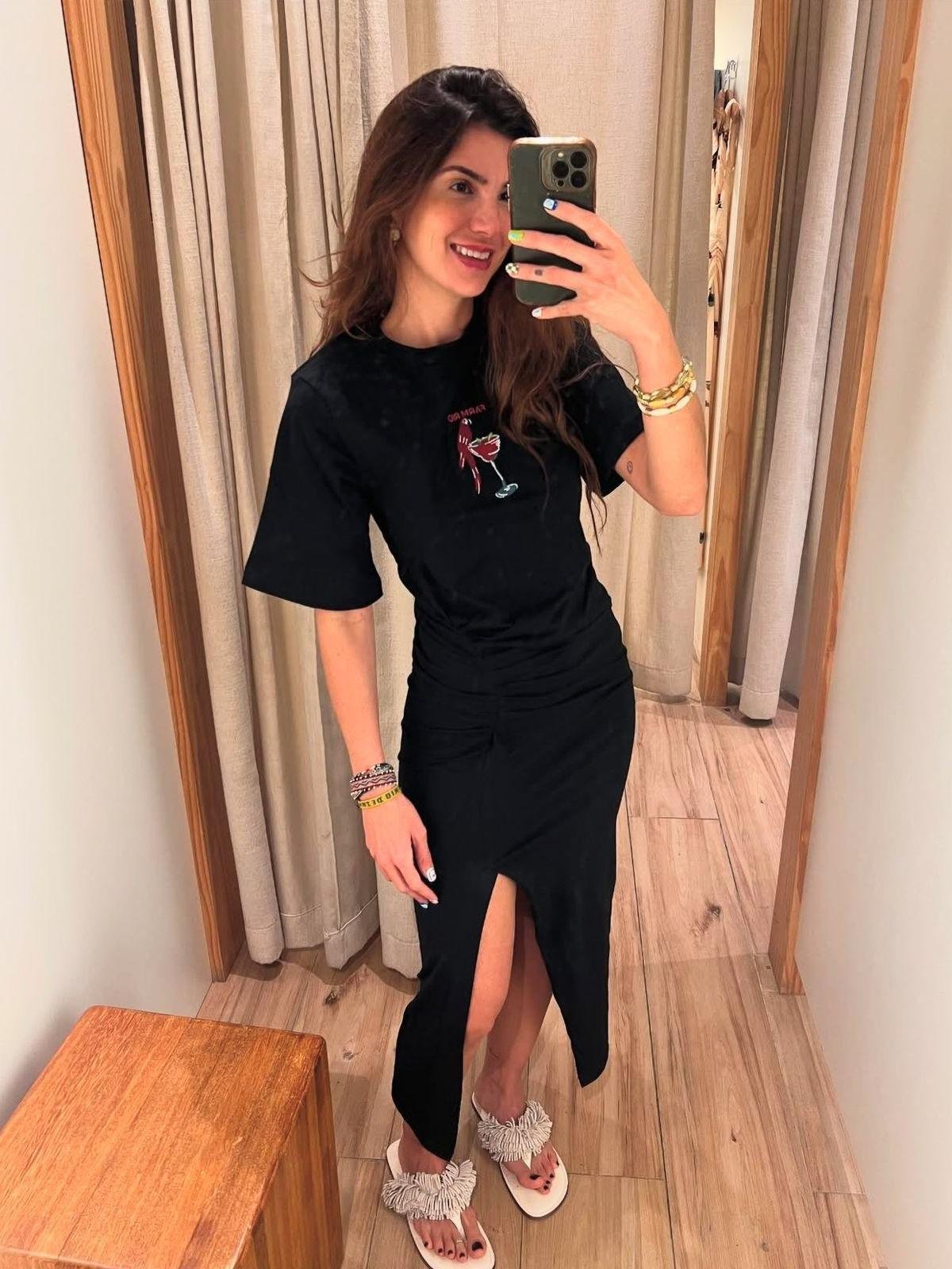 Vestido Cropped Drink Pintado Farm, possui decote redondo com acabamento de ribana, estilo t-shirt com mangas curtas, recorte na cintura com detalhe franzido que modela, comprimento longo, modelagem reta e solta, fenda lateral, com tag