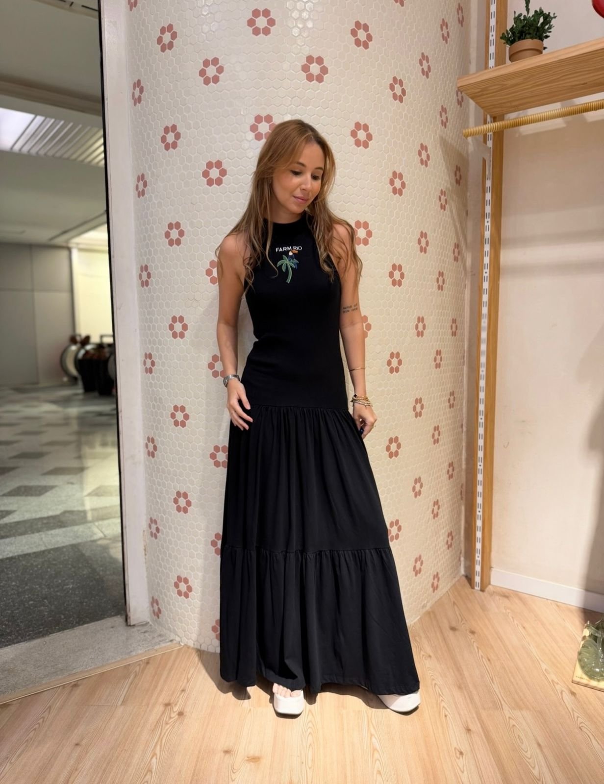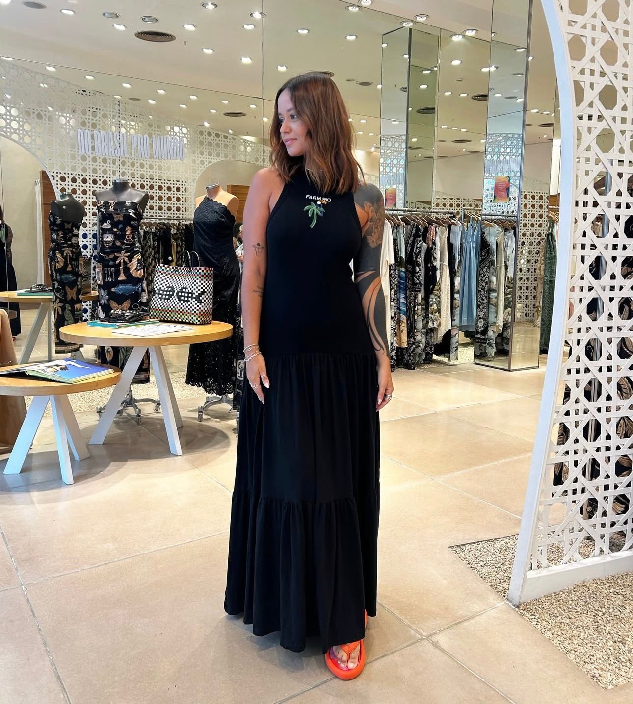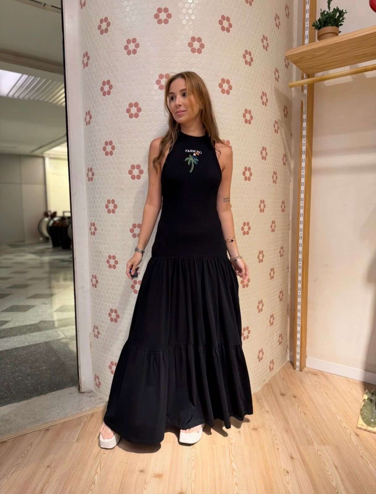 Vestido F. Cropped Marias Coqueiro, possui gola redonda, sem mangas, saia rodada, parte de cima justa ao corpo, acabamento pespontado, comprimento longo, original com tag