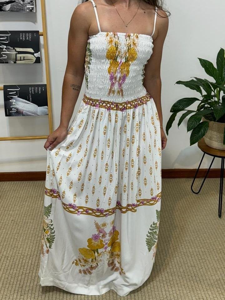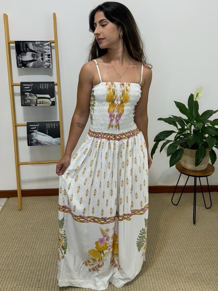 Vestido Lastex Alice Farm, possui modelagem com lastex no busto que valoriza o corpo com conforto, saia fluida, comprimento mídi, alças ajustáveis, tecido leve, estampa em cores contrastantes, com tag