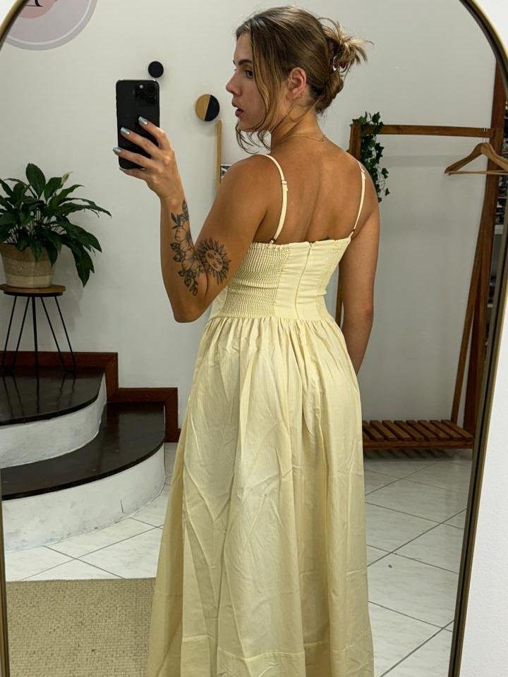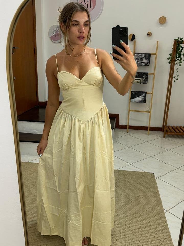Vestido Longo Listras Alexia, possui alças finas ajustáveis, decote coração, recorte no busto que modela e modelagem princesa em V na parte superior e saia rodada, lastex nas costas, fechamento por zíper invisível, estampa delicada listrada na peça inteira, original com tag