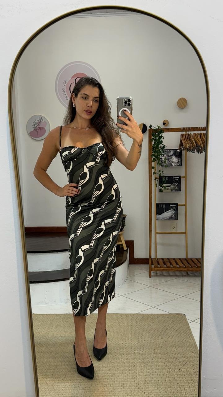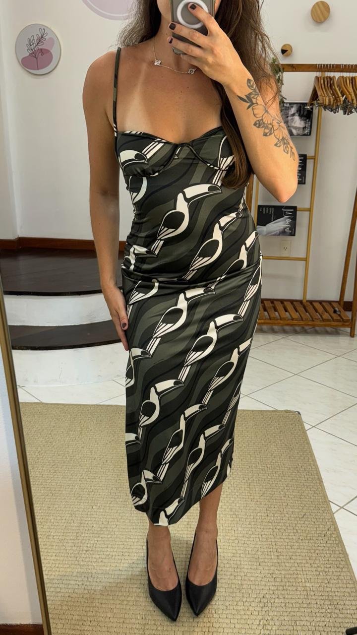 Vestido Farm Mídi Tucano Gráfico, possui decote de coração, recorte no busto que modela, modelagem justa ao corpo, alças finas ajustáveis, tecido com elasticidade, comprimento mídi, fendas laterais, estampa figurativa de tucanos, com tag