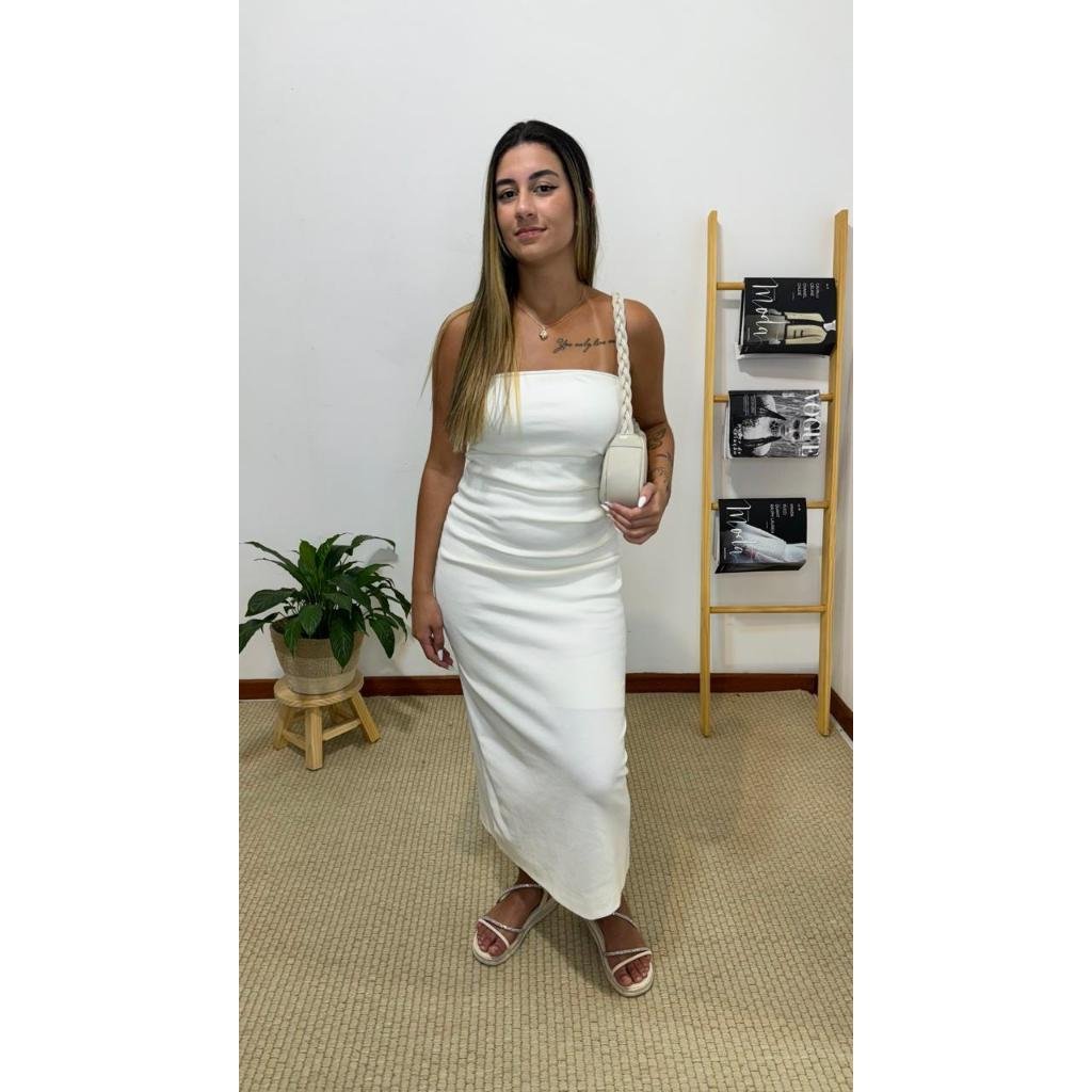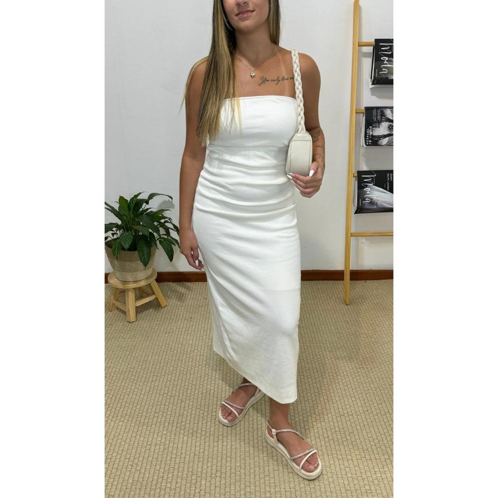 vestido farm ribana tomara que caia pregas off-white, possui decote reto, sem mangas, sem alças, com forro, detalhe frontal de pregas, comprimento midi, tecido canelado com alta elasticidade, acabamento pespontado, com tag