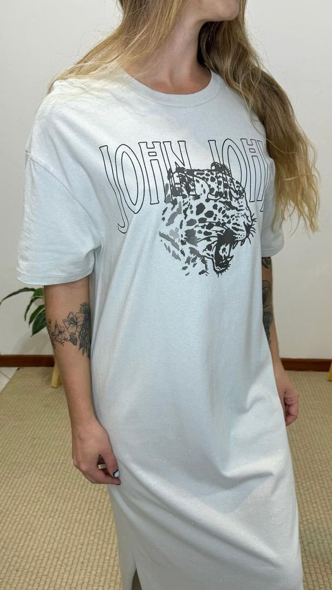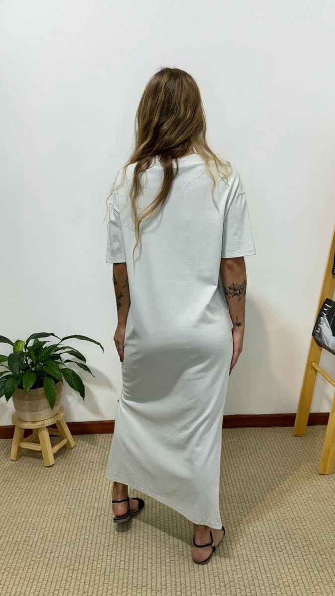 vestido JJ sharon cinza, possui gola redonda canelada, mangas curtas, fendas laterais, comprimento midi, silk frontal em alto relevo, tecido leve com partículas de brilho em trono da peça, com tag