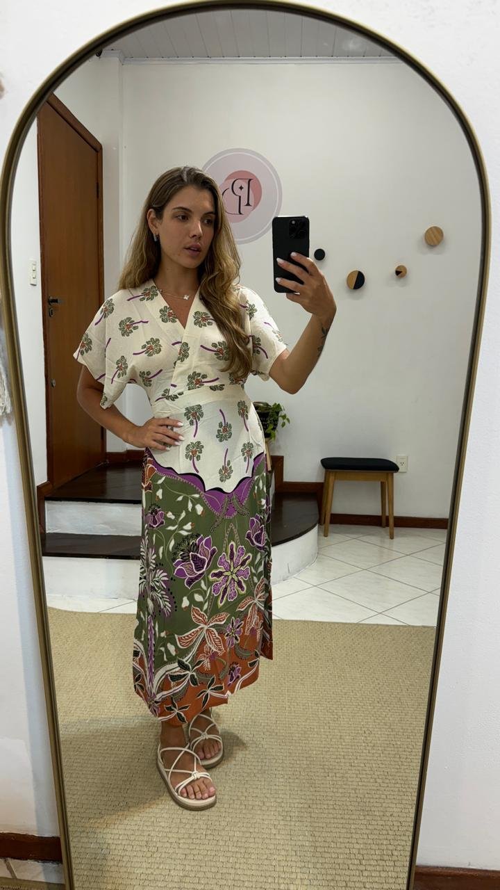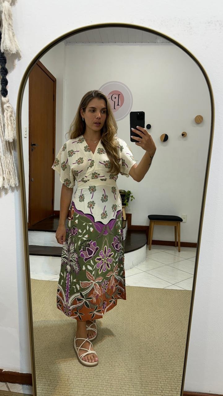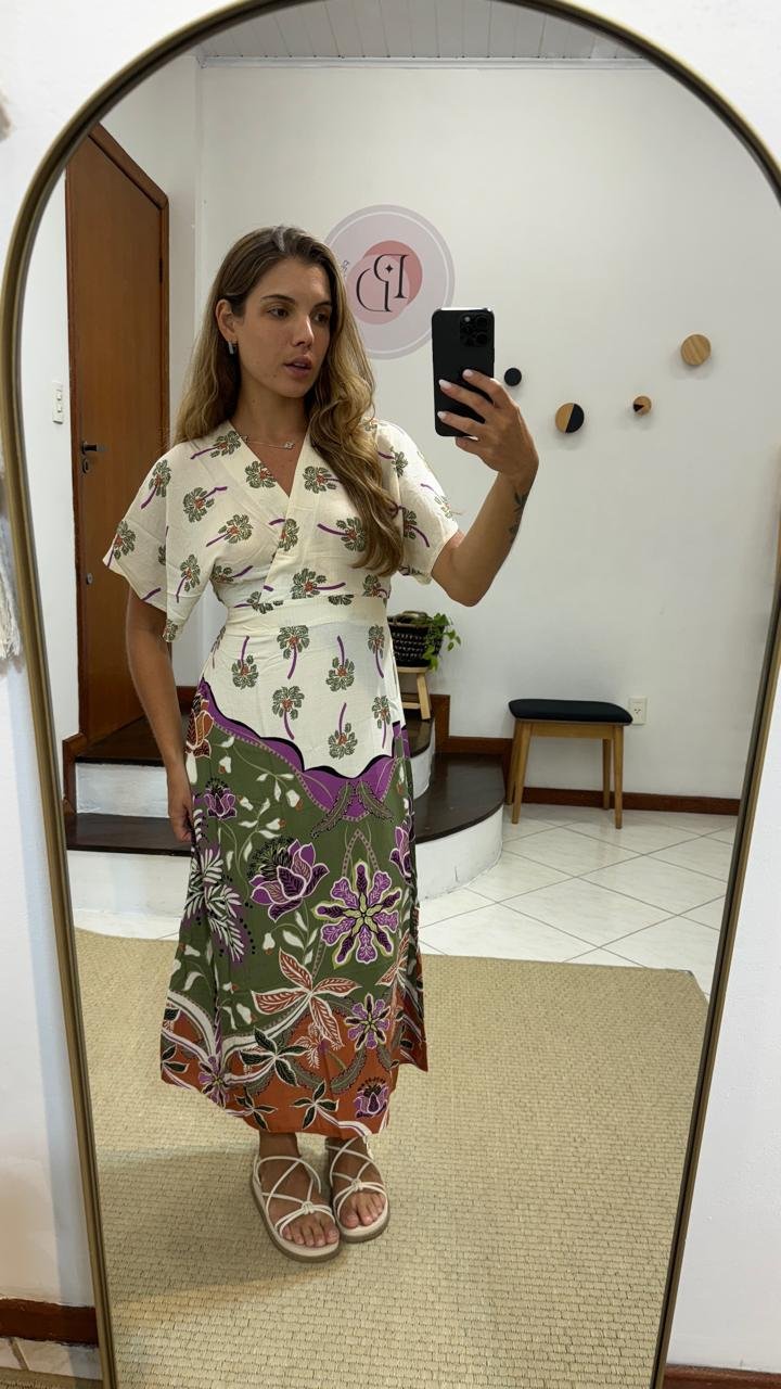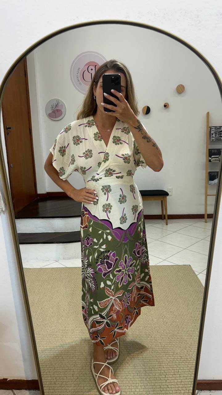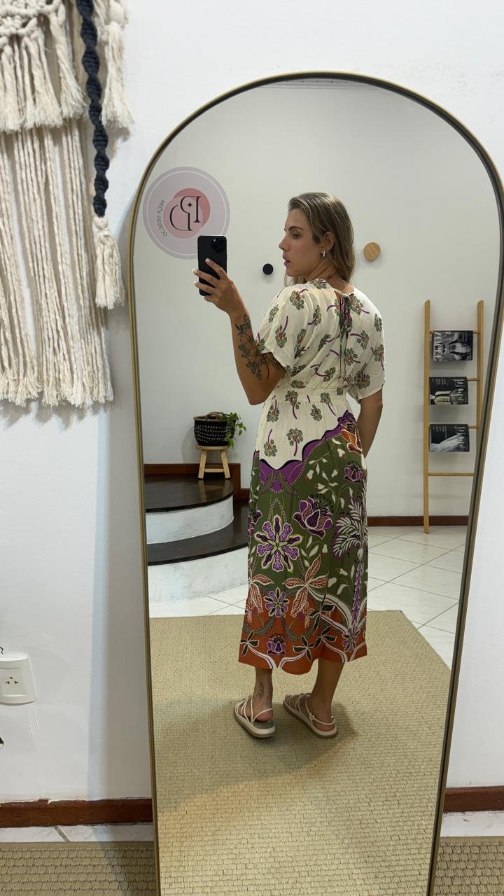 vestido zinzane estampado mavie areia, possui decote em v, manguinha 3/4, comprimento midi, tecido leve e confortavel, com tag